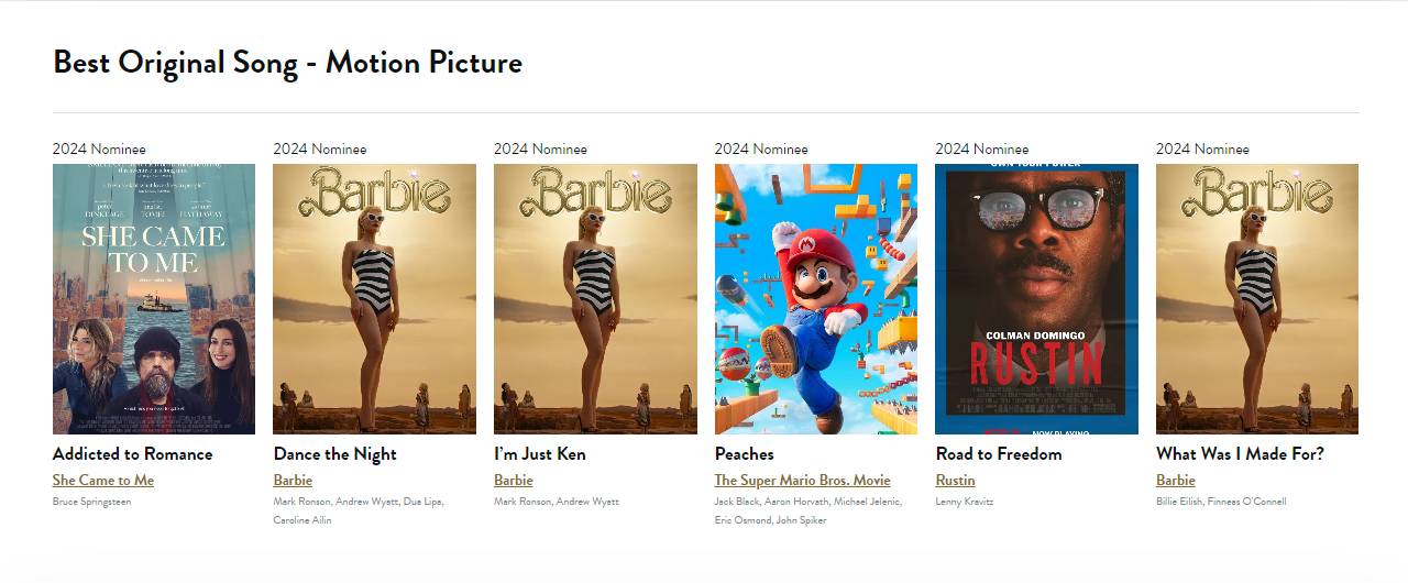 "Peaches", la canción de amor de Bowser a la Princesa Peach, fue nominada a los Globos de Oro 2024 como Mejor Canción Original, en una ceremonia donde Super Marios Bros. La Película competirá en tres categorías, incluyendo Mejor Película Animada.