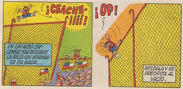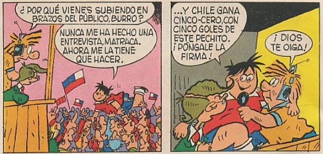 Con el balón en juego, Chile presiona y abre la cuenta en la primera opción que tiene tras gran jugada entre Pelao y Pirulete que es utilizado como jugador de quite pero demuestra su clase abriendo la cuenta y celebra encaramándose a la reja. Pero El Burro quiere llamar más la atención y se sube a la más alta, desde donde cae estrepitosamente.