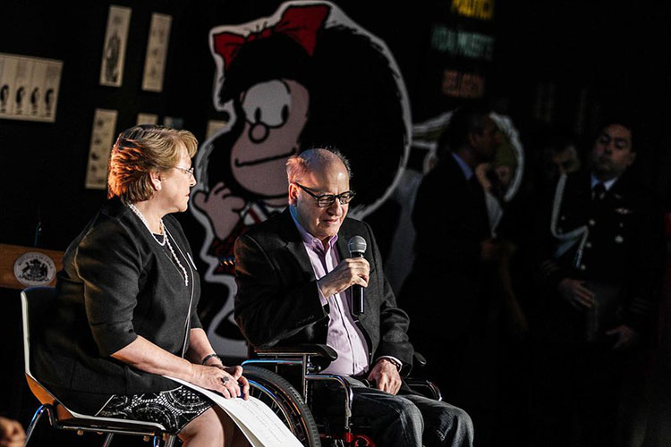 Quino recibió el reconocimiento por la entonces Presidenta Michelle Bachelet, en una ceremonia en el Centro Cultural GAM que coincidió con la exposición Quino por Mafalda del Festival Santiago a Mil.