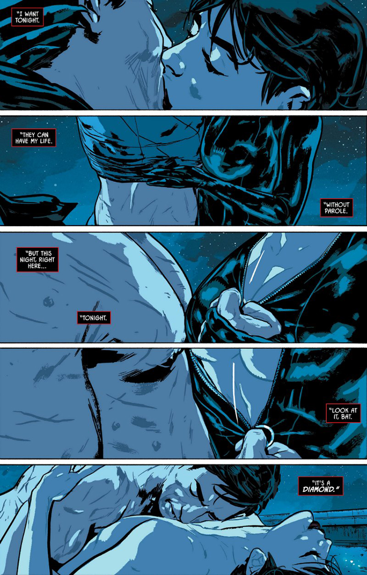 Y más recientemente, en la etapa escrita por Tom King, también hay sexo entre ambos personajes, pero el tono es completamente romántico e íntimo. No es sólo por el efecto de impacto. Es un romance y el trazo de sus dibujantes, como el de Mitch Gerads, hace de aquellos momentos algo realmente bello, como lo podemos ver en esta página del Batman #14.