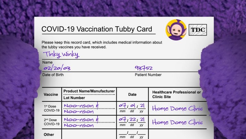 La tarjetas de vacunación también muestra que los personajes recibieron dosis de las ficticias "AstraTubbica" y "Noo-nson & Noo-nson", aunque muchos se sorprendieron de ver que su fecha de nacimiento sea el 20 de febrero de 2003. Oficialmente, ¡tienen 18 años!