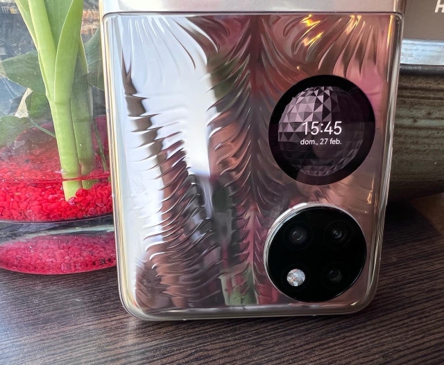 Otra diferenciación viene en su pantalla externa, la que también es OLED pero de 1.04 pulgadas y completamente redonda, tal como el módulo de cámaras, por lo que estirado y de espaldas bien se parece al P50 Pro. Sin desviarnos, esta pantalla redonda es definitivamente maravillosa permitiéndonos por fin interactuar con el smartphone más allá de mostrarnos la hora y poco más.