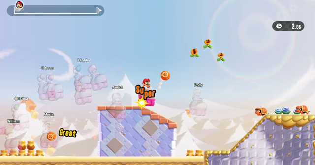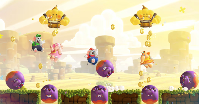 Por el lado de los enemigos tenemos a los Koopalings que han robado las Flores Belabel y cada uno se ha atrincherado en un mundo distinto del mapa general, lo que nos entrega siete nuevas fases de jefes, cada una precedida por un Wonder Effect que transforma el escenario antes del combate y convierte el enfrentamiento en un obstáculo doble al primero tener que sobrevivir al caos del efecto y luego derrotar al jefe respectivo. Es muy, muy entretenido.