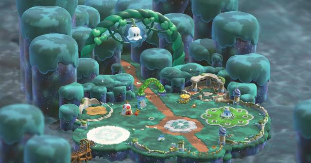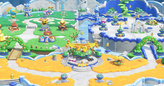 El juego transcurre en el Reino de las Flores, un territorio ajeno al Mushroom Kingdom con una personalidad visual propia que incluye colores hipersaturados, fondos animados y escenarios llenos de expresividad y aquí es donde Bowser se apodera de la Gran Flor Maravilla, lo que fusiona su cuerpo con el castillo y desata el caos en todo el reino. La premisa es sencilla, pero funciona como excusa perfecta para justificar niveles que se sienten como pequeñas explosiones creativas, cada uno con una idea diferente y propia.