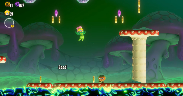 Sin embargo, en Belabel Nintendo nos vuelve a sorprender con La Transformación en Flor, una nueva forma que otorga la capacidad de lanzar flores hacia arriba para atacar enemigos aéreos —uno de los puntos ciegos del juego original— y ejecutar un flutter jump que amplía considerablemente las opciones de movilidad vertical.