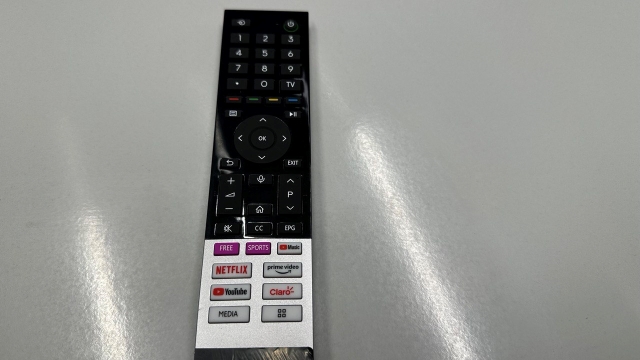 El control remoto es funcional pero las teclas se sienten algo endebles, de esas que uno sabe que si aprieta demasiado terminarán por romperse. Además, no es de tanto alcance pues cuesta operar el televisor si es que no se apunta directamente al infrarrojo. Sin embargo, es de fácil uso e incluye botones dedicados para Netflix, Prime Video, YouTube, Claro (¿?) y YouTube Music, además de otro para revisar multimedia en el equipo, imaginamos vía USB fotografías o videos.