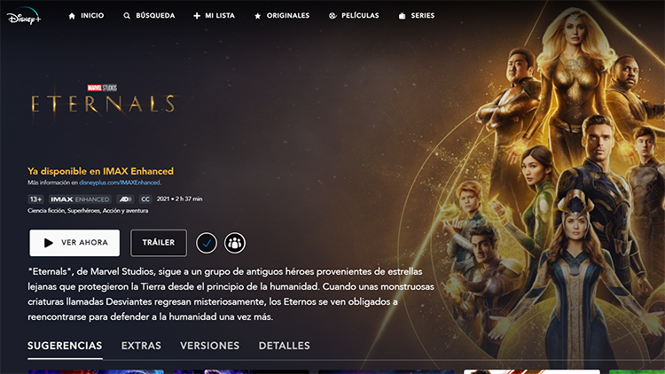 Al igual que "Shang-Chi y la Leyenda de los Diez Anillos" y otros 12 títulos de Marvel Studios, "Eternals" está disponible en formato IMAX Enhanced, entregando una relación de aspecto ampliada (1:90:1), lo que permite mostrar un 26 por ciento más de imagen. Aquel formato viene por defecto, por lo que no tienen que buscar una opción para activarlo.
