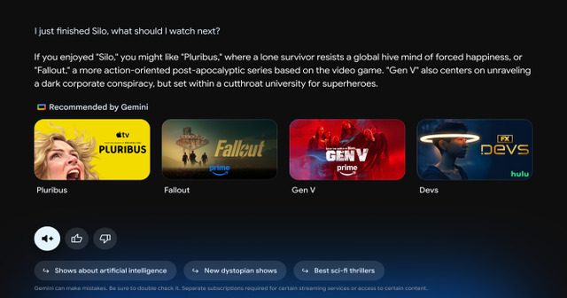 Diseñado especialmente para pantallas grandes, Gemini para Google TV permitirá buscar qué ver, obtener resúmenes de series, recomendaciones en relación al gusto de varias personas e, incluso, poder buscar películas o series en base al actor que participa en la pieza audiovisual o describiendo la trama.
