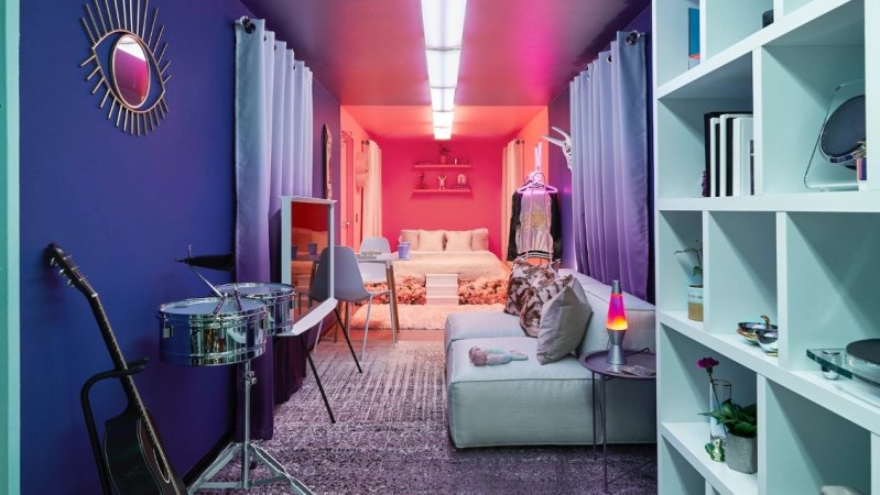 Este camión está completamente acondicionado para pasar una gran noche, incluso mejor que en algunos hoteles, pues cuenta con un dormitorio que no le falta ninguna comodidad, así como también un espacio de comedor con frigobar y también una especie de living que incluye un sillón y un Smart TV modelo The Serif de Samsung.