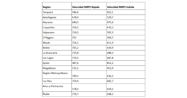 La región de Los Lagos obtuvo el promedio más alto con 776.5 Mbps de bajada, seguida por Ñuble con 770.7 Mbps y Biobío con 765.2 Mbps. Estos resultados superan incluso a la Región Metropolitana, que alcanzó 749.1 Mbps, demostrando que la política pública de fortalecer la conectividad regional está dando frutos.