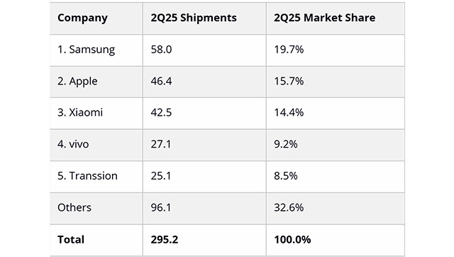 Apple quedó en segundo lugar con 46,4 millones de unidades y una participación de 15,7%, una baja respecto al primer trimestre del año. La caída se atribuye al “efecto espera” por el próximo lanzamiento del iPhone 17 en septiembre. Por su parte, Xiaomi logró consolidarse como un fuerte tercer competidor con 42,5 millones de smartphones enviados, captando el 14,4% del mercado.