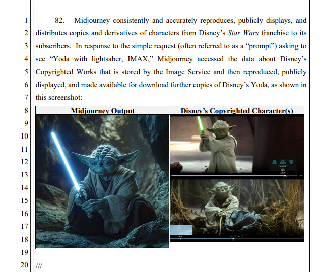 En la demanda, presentada por los estudios a principios de esta semana en un tribunal federal de California, los afectados se refieren a Midjourney como una "máquina expendedora virtual" que genera "copias interminables no autorizadas de las obras protegidas por derechos de autor de Disney y Universal". El texto (que, gracias a Variety, puedes leer aquí) incluye imágenes generadas por usuarios de Midjourney que, sin duda, le dan la razón de los alegatos a Disney y Universal.