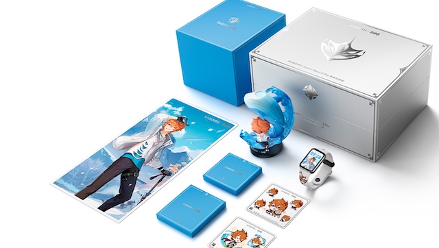 Pero no piensen que es solo eso, ya que la cosa se pone maravillosa con el cargador que trae la exclusiva caja (que además incluye stickers, pósters y un par de cosas más) puesto que es una figura de Tartaglia que en la parte superior es donde se carga el dispositivo.