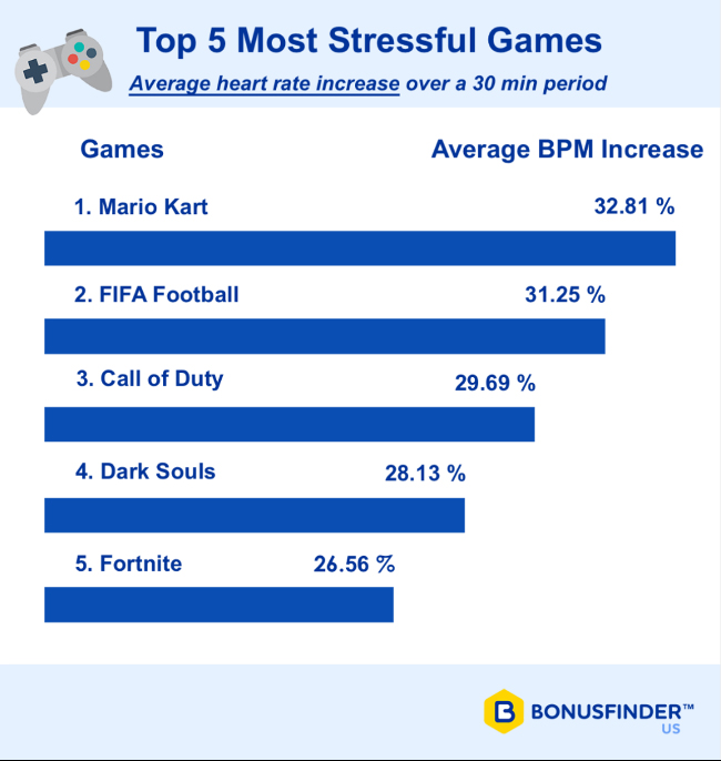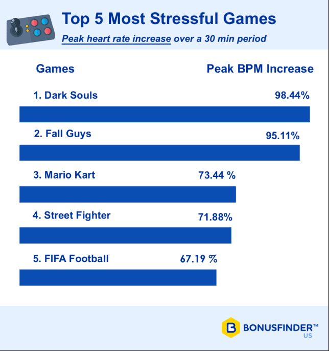 Para demostrar que efectivamente hay juegos que son más estresantes que otros, desde la web estadounidense BonusFinder condujeron un estudio que reunió a catorce jugadores -que se autodenominaron gamers- bajo los siguientes requisitos: jugar al menos 15 horas a la semana y conocer los dieciséis títulos para consola, PC y móvil más populares y desafiantes del mercado que fueron seleccionados para el experimento.